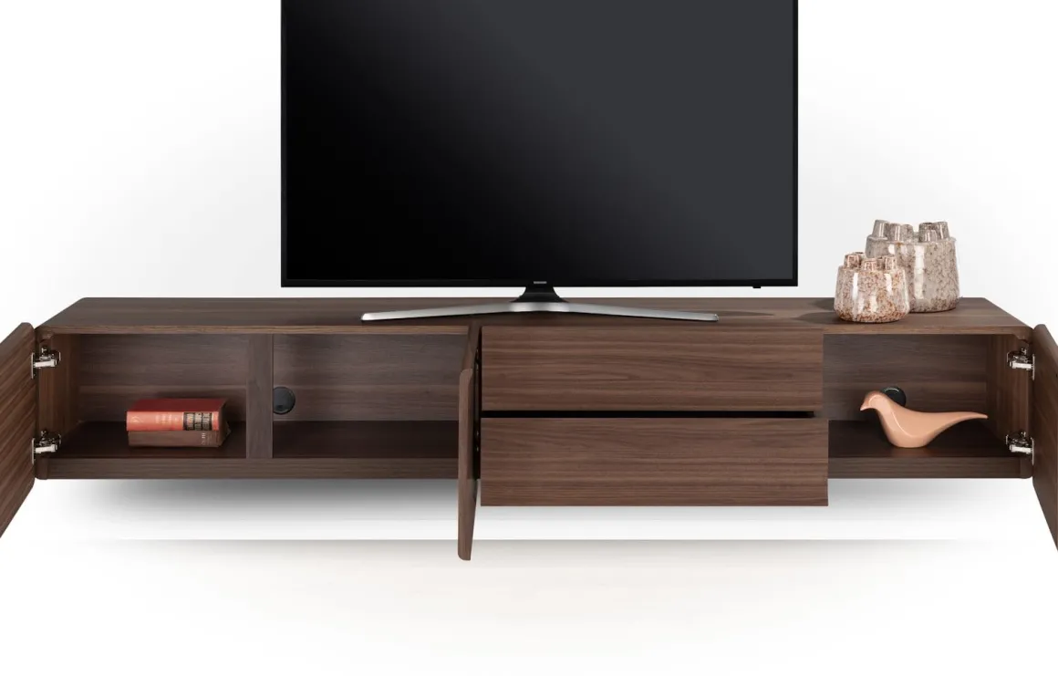 Het BRIANZA lowboard verdient een prominente plek in je interieur. Dit stijlvolle meubel combineert een strakke, moderne look met optimaal gebruiksgemak. Het is afgewerkt in gelakt notenfineer, waarbij de zichtbare nerfstructuur prachtig in één vloeiende lijn doorloopt over de volledige breedte. Het lowboard heeft drie greeploze deuren en twee laden, allemaal uitgerust met softclose voor een geruisloze bediening. De afgeronde hoeken van ombouw en bovenblad sluiten naadloos aan op de afgeronde poten in notenfineer. Extra bijzonder: de fronten hebben een subtiele opstaande rand die samen één elegante lijst vormen. Plaats dit lowboard staand of kies voor wandmontage voor een ruimtelijk, zwevend effect.