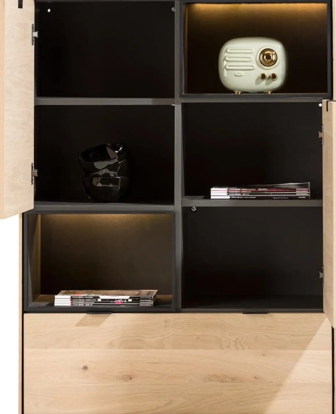 Met onze nieuwe serie ELEMENTS haal je de interieurstylist in je naar boven! Je stelt namelijk met alle losse ELEMENTS items jouw (wand)kast helemaal naar eigen wens samen. Gebruik dit naturel eiken fineer highboard van 120 cm hoog en 90 cm breed voorzien van 2 deuren, 1 lade en 2 met led verlichte niches als opzetstuk en combineer het met andere ELEMENTS items in bijvoorbeeld onyx, lak groen, of lak zwart. Ga je voor een XS opstelling of pak je groots uit en wordt het een XXL kast?