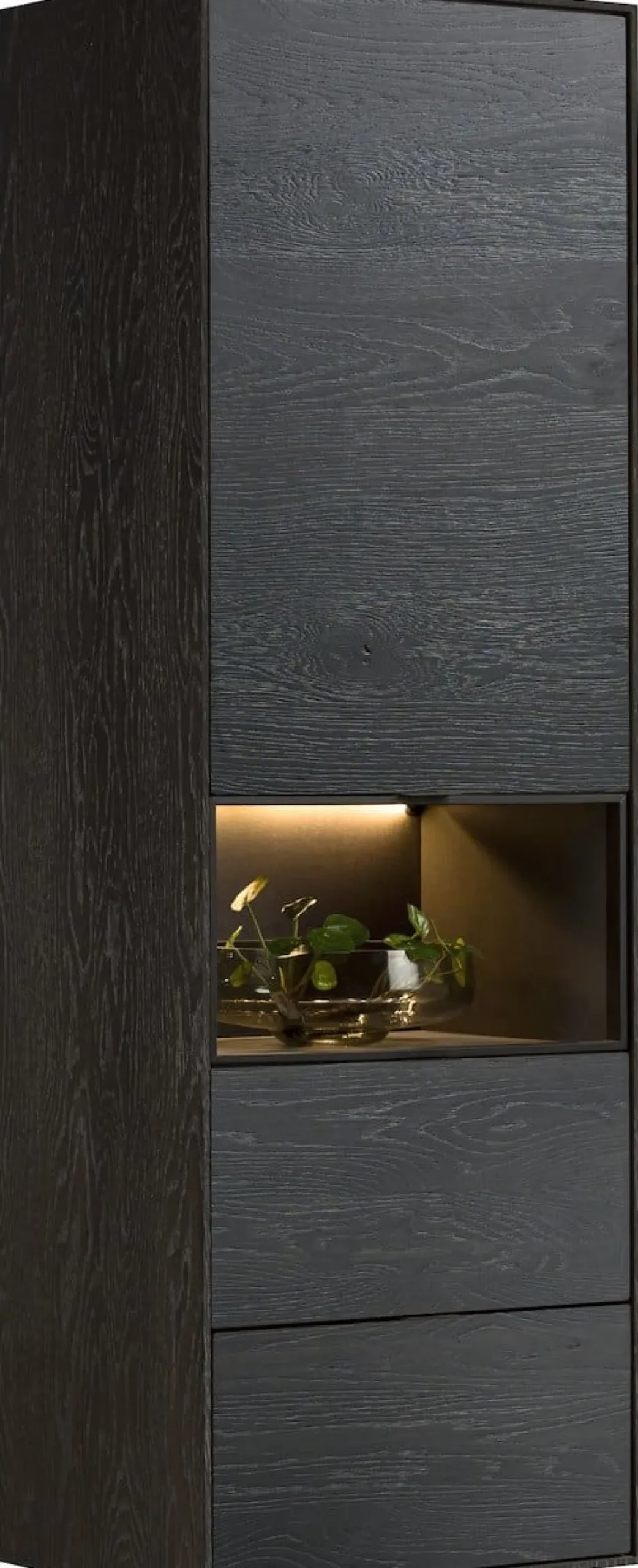 Met onze nieuwe serie ELEMENTS haal je de interieurstylist in je naar boven! Je stelt namelijk met alle losse ELEMENTS items jouw (wand)kast helemaal naar eigen wens samen. Gebruik deze onyx kleur bergkast die 60 cm smal is en voorzien van 1 deur, 2 laden en 1 met led verlichte niche als basis en combineer hem met andere ELEMENTS items in bijvoorbeeld naturel eiken fineer, lak groen, of lak zwart. Ga je voor een XS opstelling of pak je groots uit en wordt het een XXL kast?
