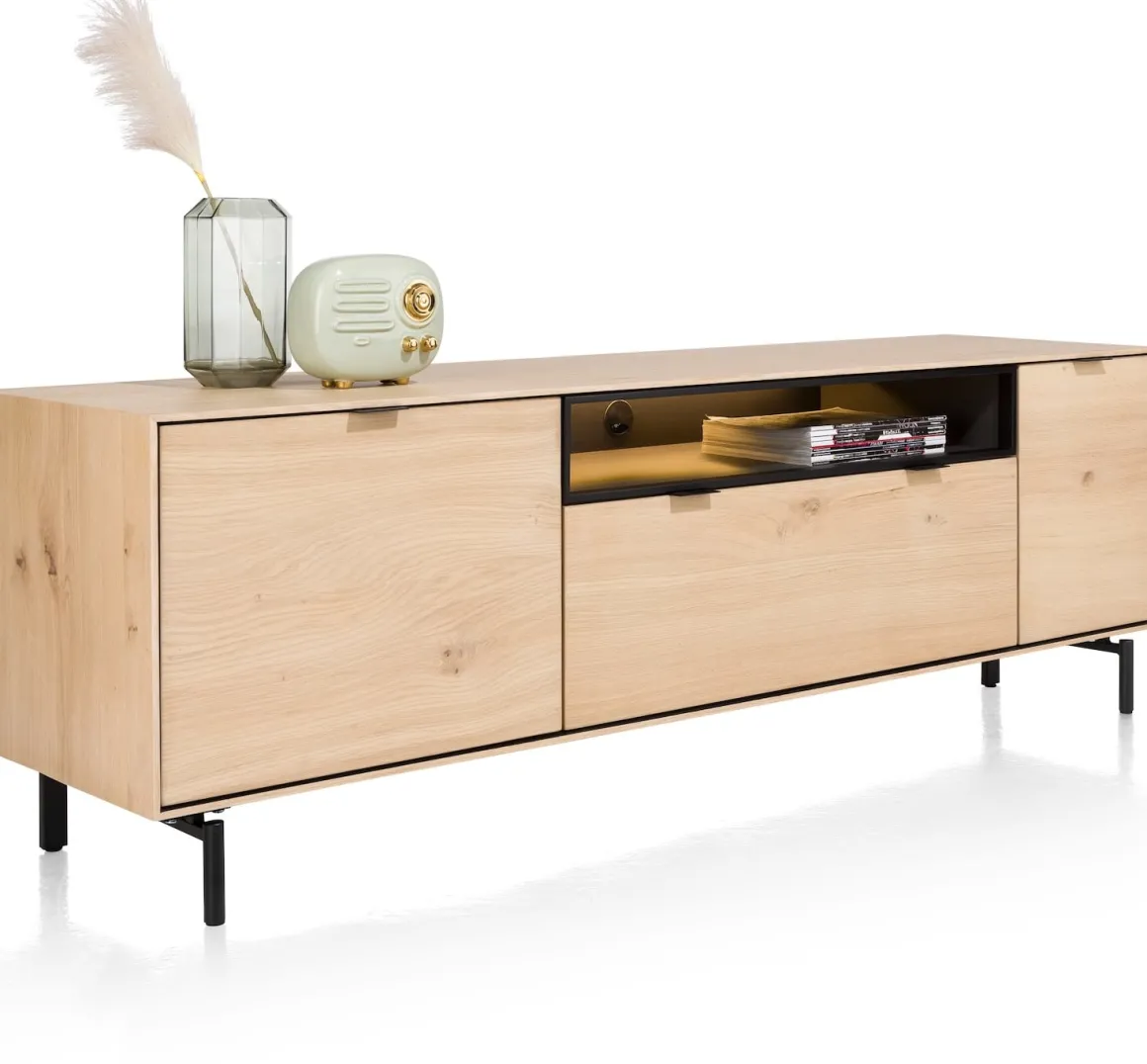 Elements, lowboard 180 cm. – hang + 1-deur + 1-lade + klep + 1-niche + led incl. metalen poten – natural