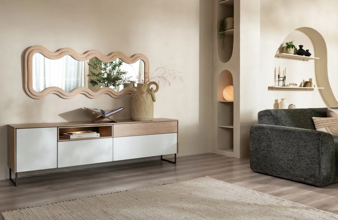 Zoek je een tv-meubel met een strakke belijning en een natuurlijke look? Dan is dit greeploze lowboard LINDFIELD echt iets voor jou! LINDFIELD is een tv-meubel met witte fronten, afgewisseld met eikenlook elementen en een rank onderstel. Het lowboard is gemaakt van Laminato (melamine). Het is 200 cm breed en heeft 1 deur, 3 laden en 1 niche met ledverlichting. De LINDFIELD collectie is geliefd vanwege zijn eenvoud en gaat perfect samen met de andere elementen van de collectie.
