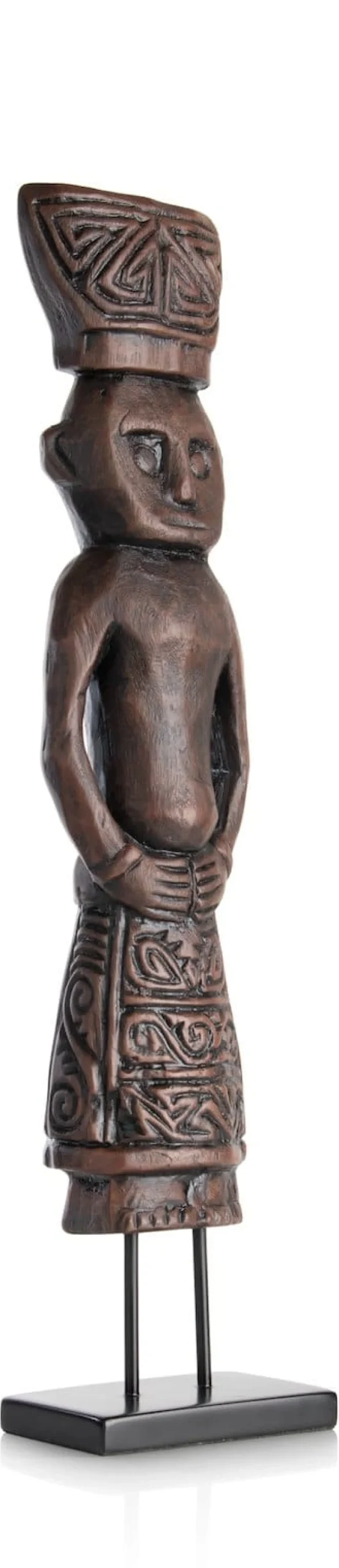 Dromen van verre oorden is altijd fijn toch? De beeldenserie MILAN van COCOmaison brengt je onmiddellijk in de sfeer van exotische plekken met witte stranden en zon in overvloed. Elk beeld is handgekerft uit lichte kunsthars en daardoor uniek. De beelden zijn donkerbruin en hebben een verweerde houtlook, waardoor je ze amper van originele houtsnijwerken kunt onderscheiden. Dit beeld is 68 cm groot, zijn ‘broertjes’ variëren in grootte van 62 tot 86 cm. Plaats er een of twee op een tafel of buffetkast en droom heerlijk verder tot je volgende vakantie!