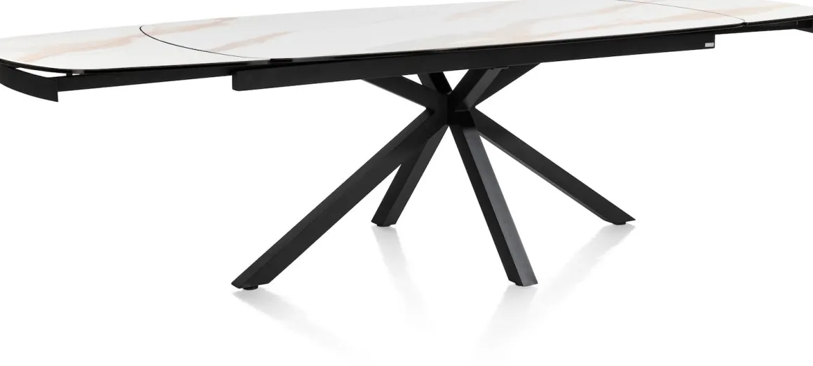 Ideaal voor onverwachte eters: een ovale tafel die ook nog eens uitschuifbaar is! Uitschuiftafel MONTELLO is ontzettend stijlvol én praktisch tegelijk. Het witte marmerlook blad van keramiek op glas heeft een chique uitstraling en staat op een zwart metalen poot. Deze uitschuiftafel is met 50 cm uit te schuiven aan weerszijden tot 300 cm en is er ook met zwart blad!