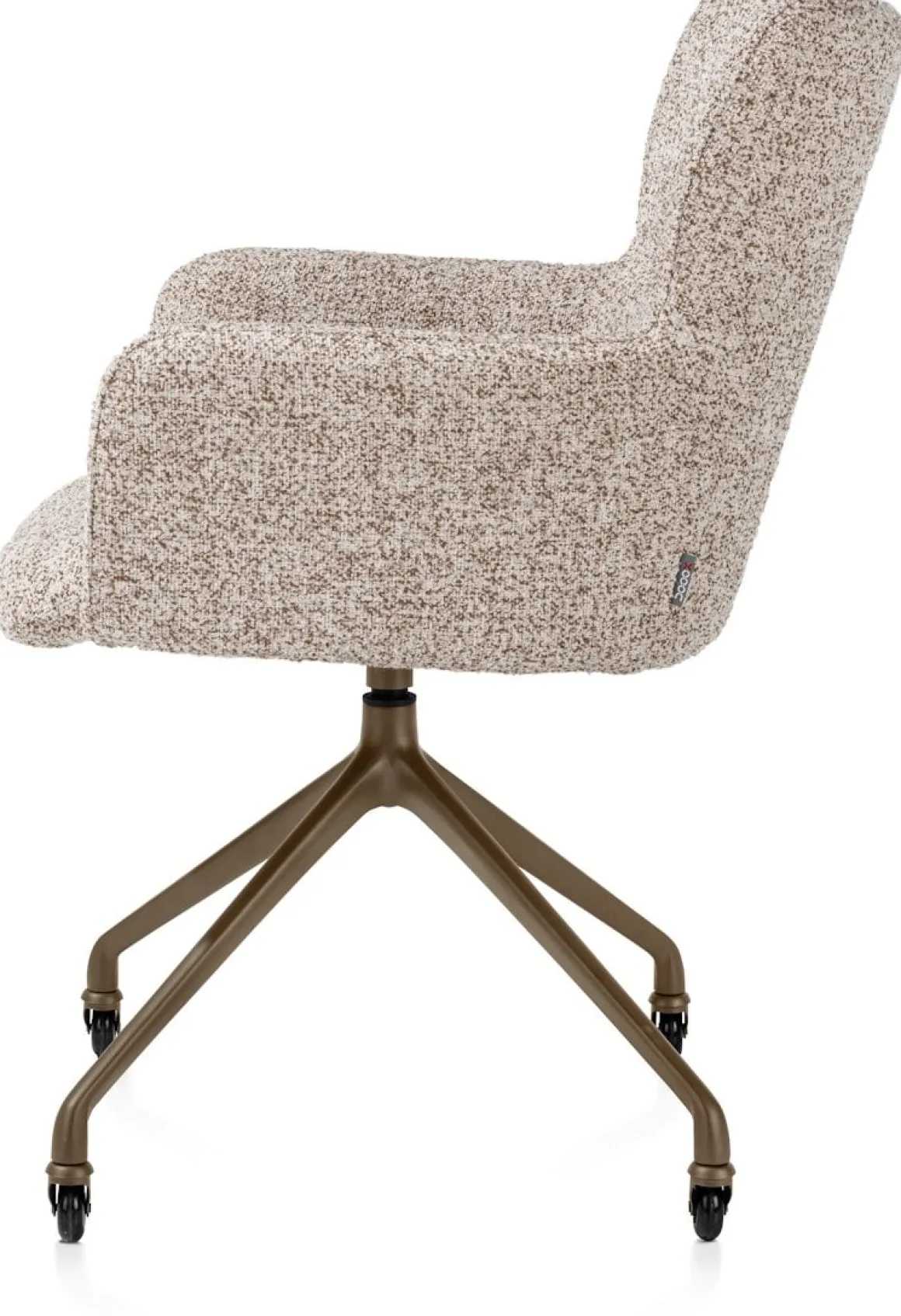 Armstoel SAGE in koperkleur brengt warmte en verfijning in je interieur. SAGE is bekleed met de zachte bekleding in stof Luton; een comfortabele bouclé met een mooie structuur die deze stoel extra uitnodigend maakt. Het aluminium frame in steelbrown geeft een natuurlijke, rustige basis, terwijl de handige wieltjes zorgen voor extra flexibiliteit. Ideaal aan de eettafel of als luxe bureaustoel in een huiselijke setting. Armstoel SAGE is er in meerdere kleuren en afwerkingen. Ontdek jouw favoriet.