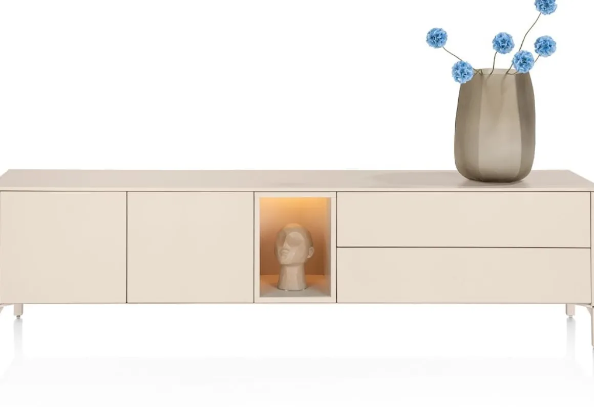Trentino, Lowboard 210 cm. – 2-deuren + 2-laden + 1-niche – mdf gelakt – Creme