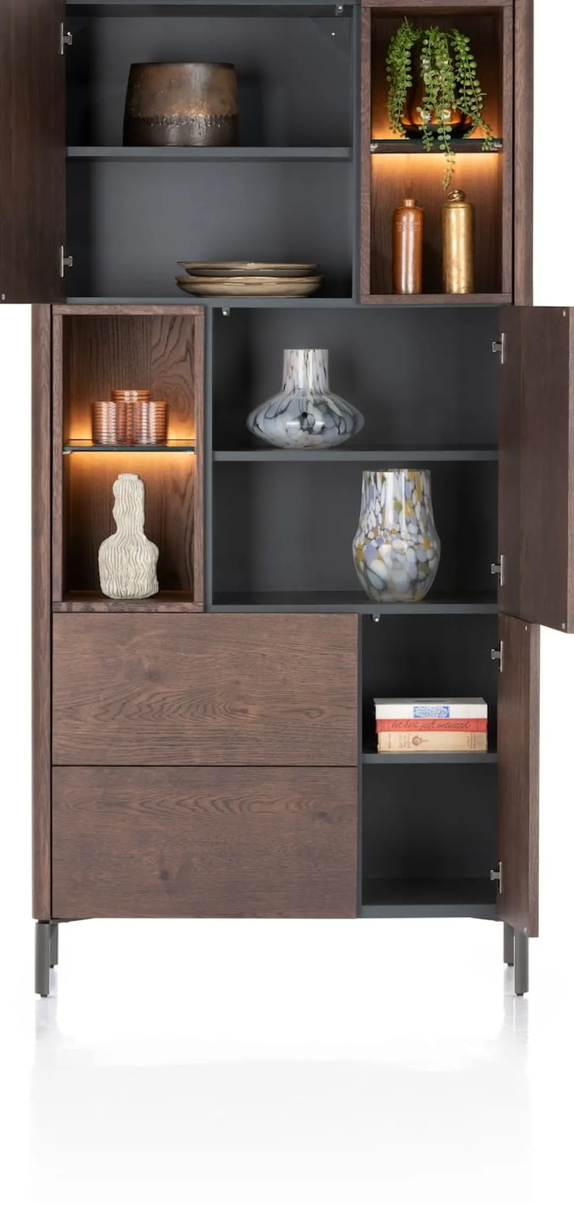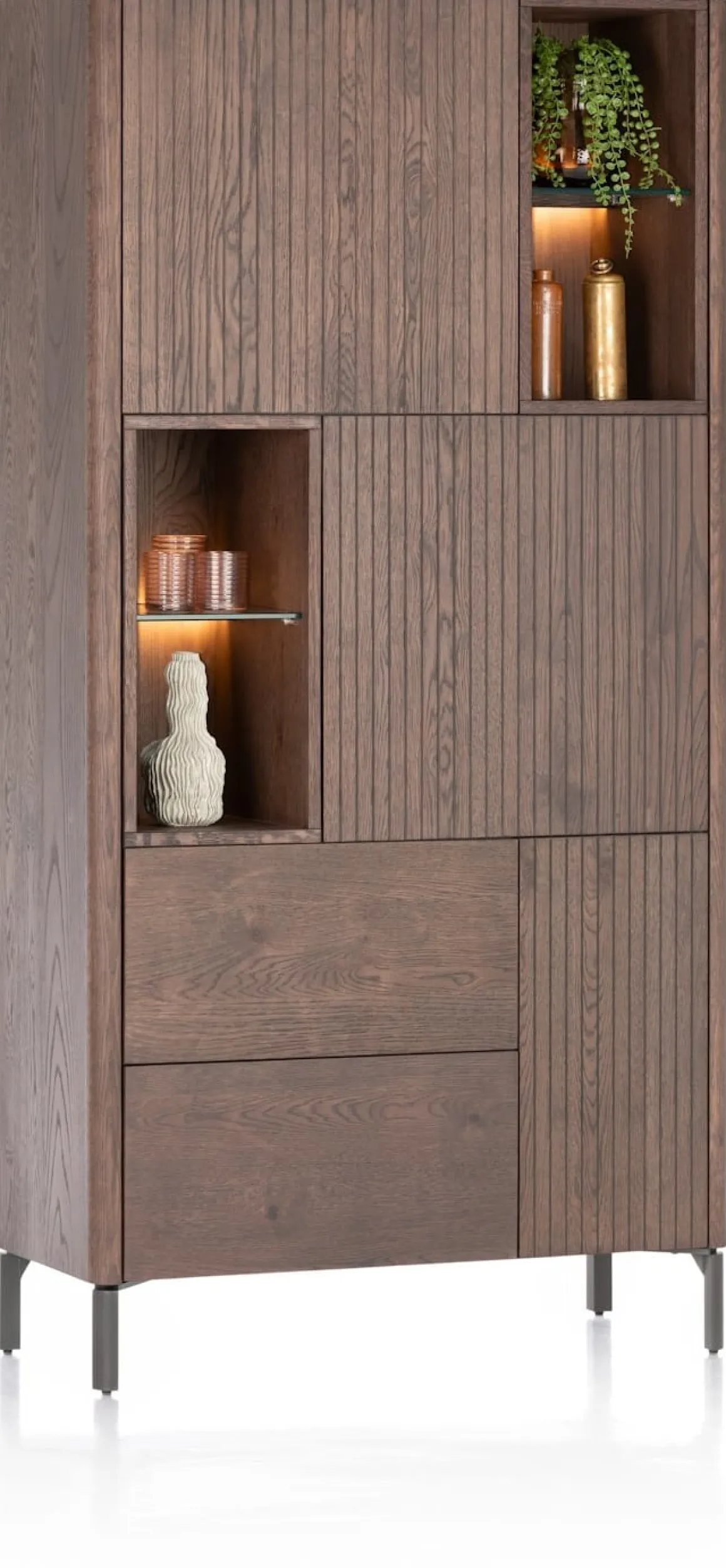 Will jij graag in stijl je spullen opbergen? Kijk dan eens naar deze bergkast uit de TRENTON serie van XOOON. De bergkast heeft een speels latjesmotief en is vervaardigd van eikenfineer in de kleur clay. TRENTON beschikt over 3-deuren + 2-laden + 4-niches en is voorzien van een praktisch push to open systeem. Dankzij de ledverlichting in de niches kun je je mooiste accessoires extra laten shinen. Het dressette staat op een grafietkleurig onderstel van metaal. Je shopt hem ook in de kleur naturel.