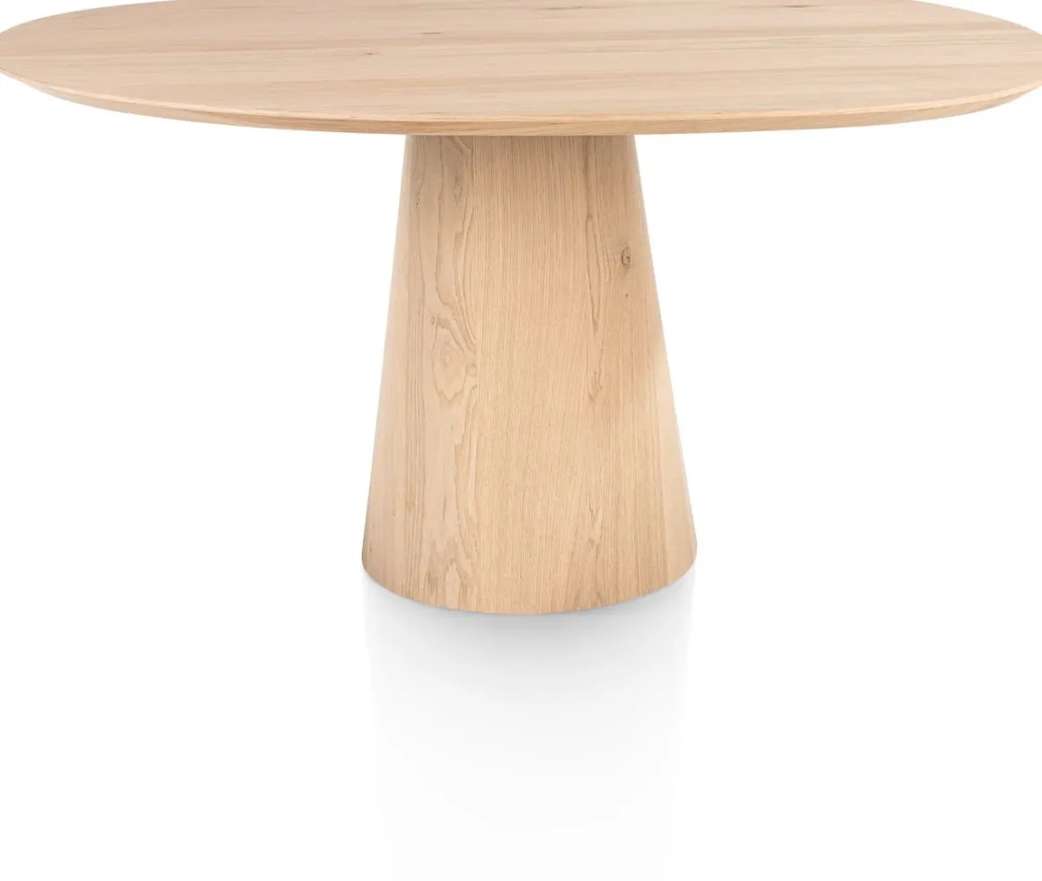 TRENTON is een prachtige eetkamertafel met een organisch gevormd blad in de kleur naturel. De eetkamertafel is vervaardigd van eikenfineer en pronkt op een centrale conische poot. De poot is aan de binnenzijde verzwaard om maximale stabilteit van de tafel te garanderen. Het tafelblad heeft een afmeting van 150 x 120 cm en is ook verkrijgbaar in de kleur clay. Laat je ook verrassen door de salontafels en kasten uit de TRENTON serie!