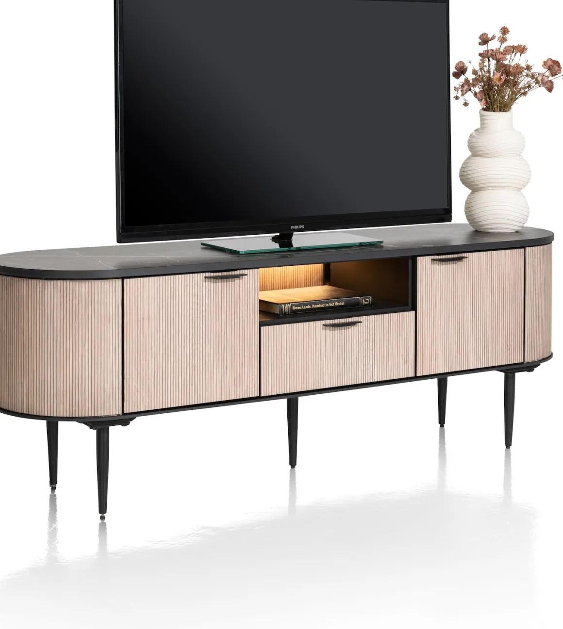 Ben je op zoek naar een mooi lowboard om bijvoorbeeld je tv op te zetten? Laat je verrassen door dit lage kastje uit de ARAMON serie, geïnspireerd op klassiek design uit de eerste helft van de 20e eeuw. Het lowboard is 170 cm breed, heeft een HPL bovenblad met een zwarte marmerlook en staat op conische poten. De afgeronde zijpanelen zijn afgewerkt met een stijlvolle verticale lattenstructuur. ARAMON is voorzien van 1 niche met LED-verlichting en heeft 2 deuren en 1 lade.