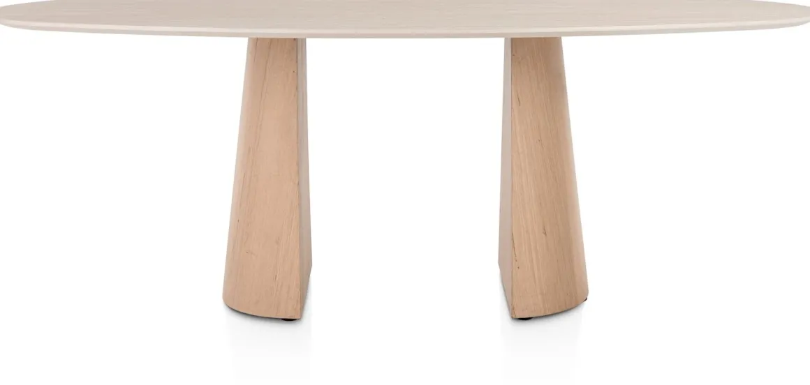 Ben je op zoek naar een eetkamertafel met vriendelijke, ronde vormen? Laat je verrassen door deze ovalen eetkamertafel ARAS met blad van Primo Laminato (HPL) in travertinlook. ARAS heeft een afmeting van 210 x 120 cm en staat op twee halve conische poten afgewerkt in gelakt eikenfineer. De poten zijn aan de binnenzijde verzwaard om maximale stabilteit van de tafel te garanderen. Zie jij jezelf al zitten?
