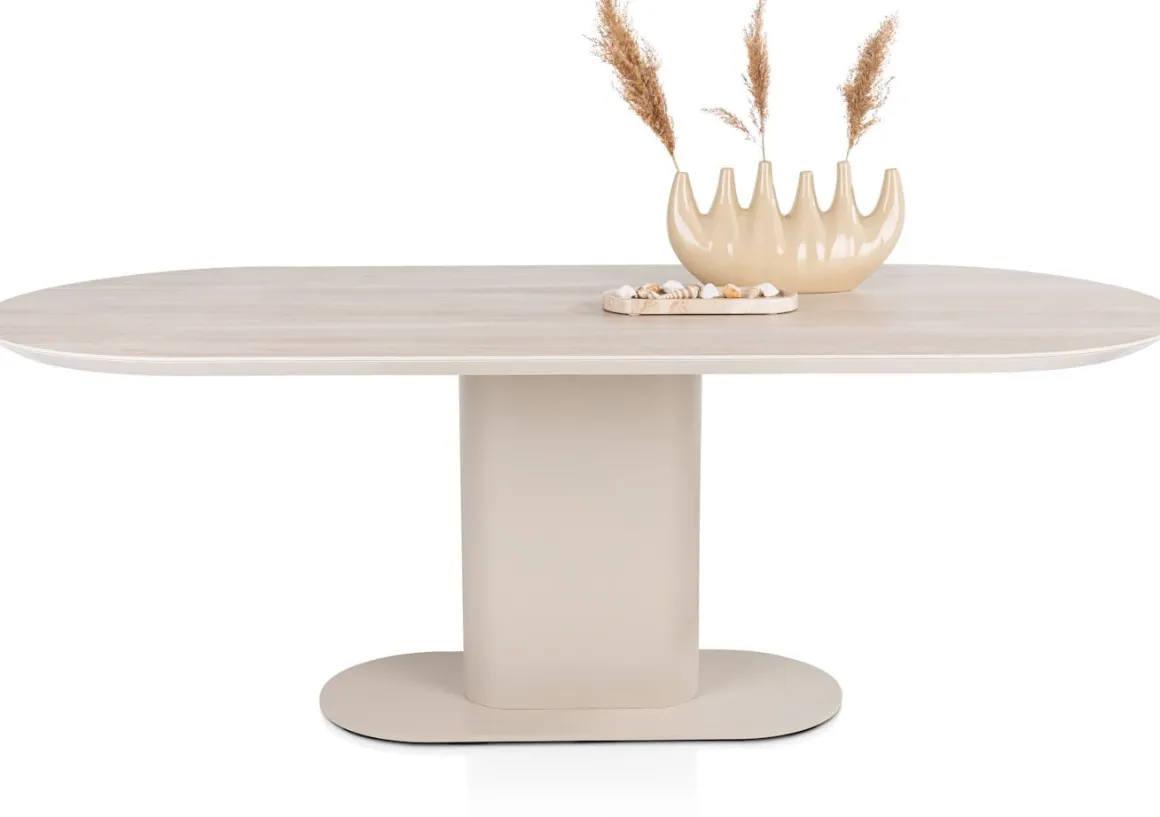 Eetkamertafel BRIANTO van 210 × 100 cm brengt een stijlvolle mix van modern design en klassieke elegantie in huis. Het ovale blad met keramische travertinlook geeft de tafel een warme, natuurlijke uitstraling. De schuine, verjongde rand maakt het geheel luchtig en verfijnd. De robuuste metalen kolompoot staat op een ovalen voet en is verkrijgbaar in crème of steelbrown. Met zijn tijdloze look en praktische keramiekblad is BRIANTO dé eyecatcher voor een eigentijdse eethoek met karakter. BRIANTO is er in meerdere afmetingen; kijk welk formaat het mooist tot zijn recht komt in jouw interieur.