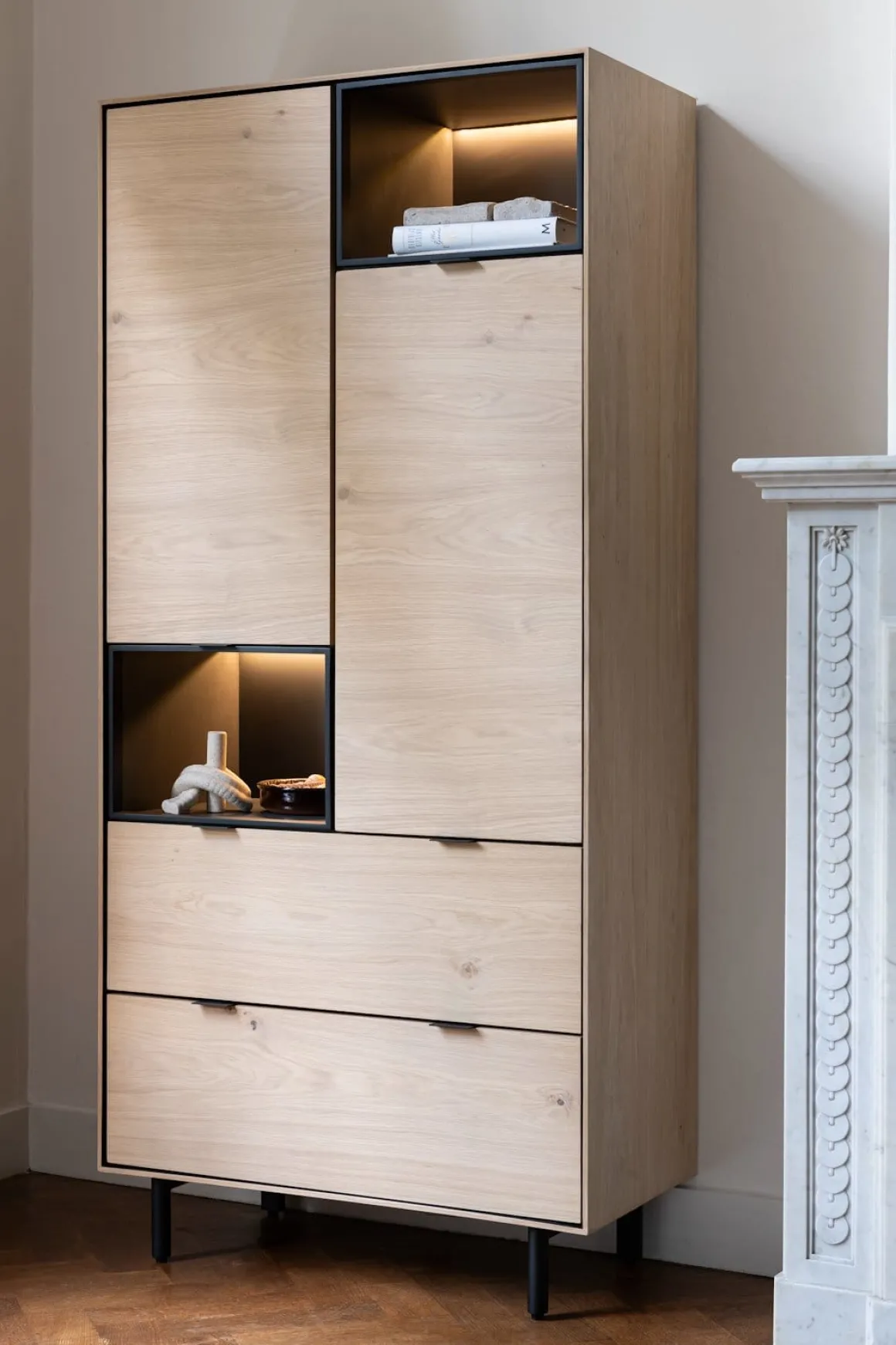 Met onze nieuwe serie ELEMENTS komt de interieurstylist in jou naar boven! Je kunt namelijk met alle losse ELEMENTS items jouw (wand)kast helemaal naar eigen wens samenstellen. Combineer deze naturel bergkast van 90 cm met 2 deuren, 2 laden + 2 met LED verlichte niches samen met andere ELEMENTS in bijvoorbeeld onyx eiken fineer of lak groen of zwart, en style er lekker op los! De lades in dit element bevatten een subtiel zwart handgreepje. Ga je voor een XS opstelling of pak je groots uit en wordt het een XXL kast?
