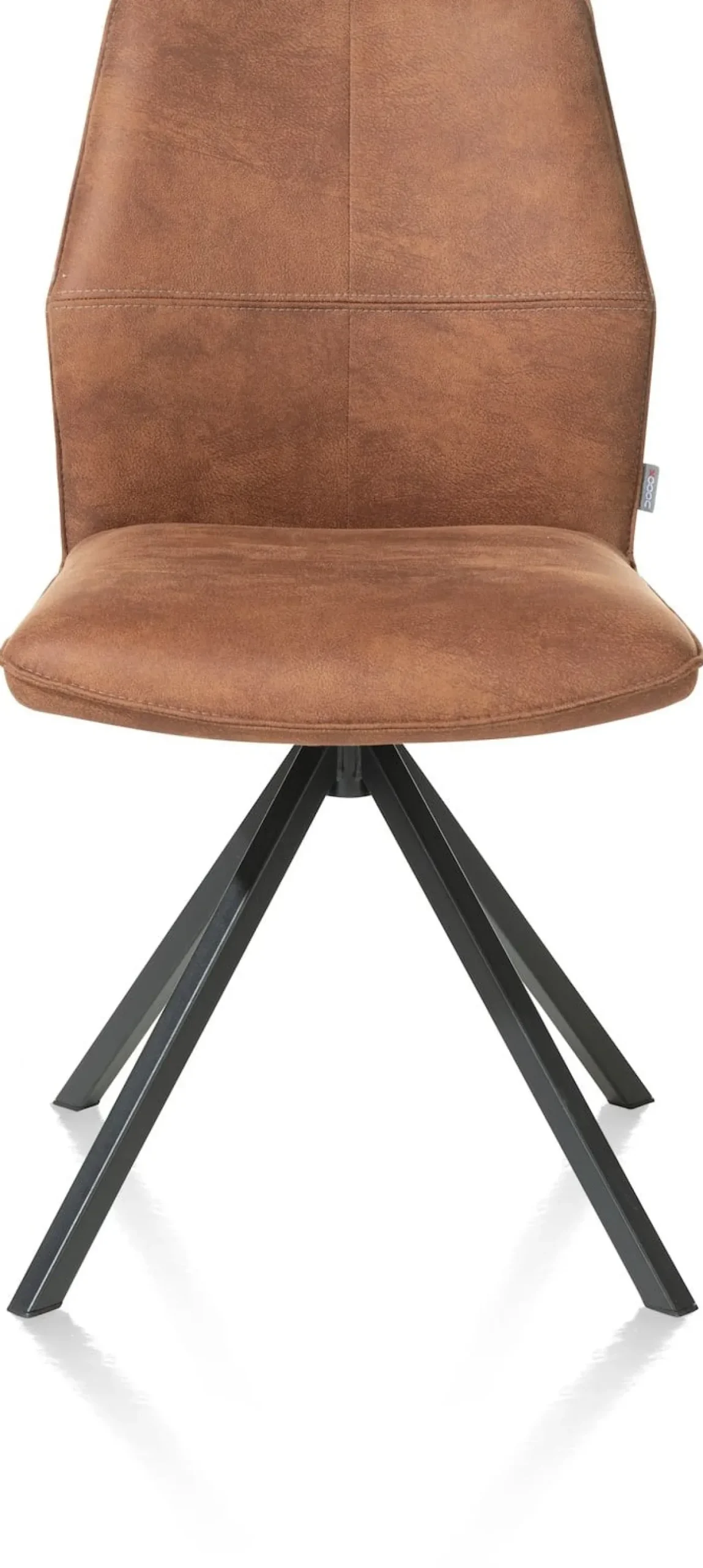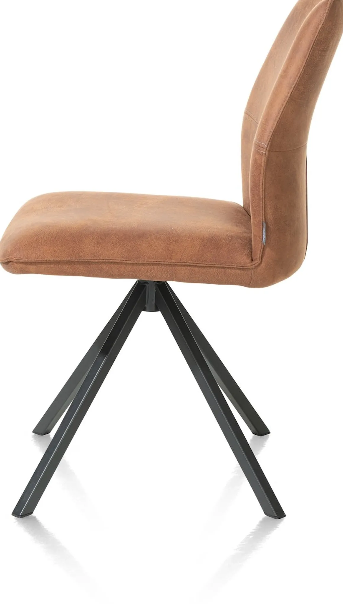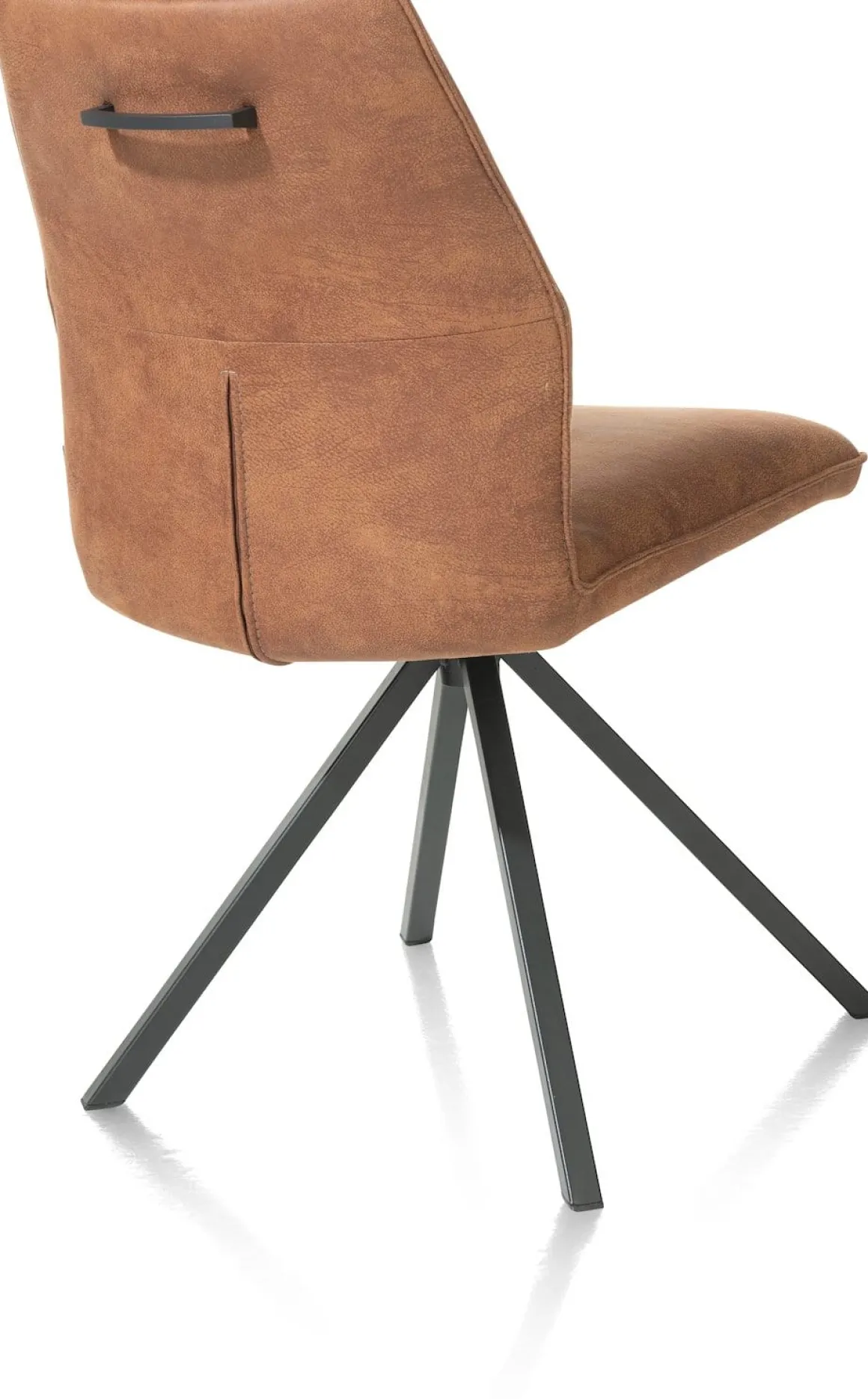 Eetkamerstoel FRANKY in de kleur cognac is een eetkamerstoel met een stoer en modern design. Je kunt hem naar eigen wens personaliseren, dus houd je vooral niet in! Kies je bekleding uit een aantal stoffen en kleuren in uni of duo. FRANKY staat op een centrale 4-poot van zwart metaal. Hij is draaibaar, en hij heeft een handige handgreep op de rug, zodat je er letterlijk alle kanten mee op kunt! FRANKY is ook verkrijgbaar met een vast frame en als armstoel. Voor welke uitvoering ga jij?
