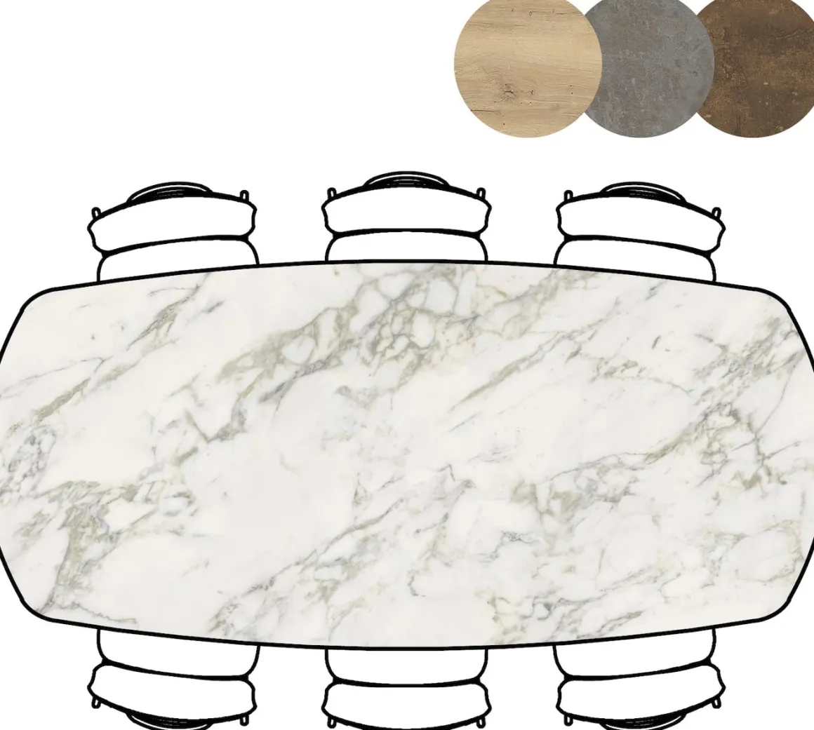 blad in Primo Laminato (HPL) – marmerlook wit – onderstel in metaal, zwart