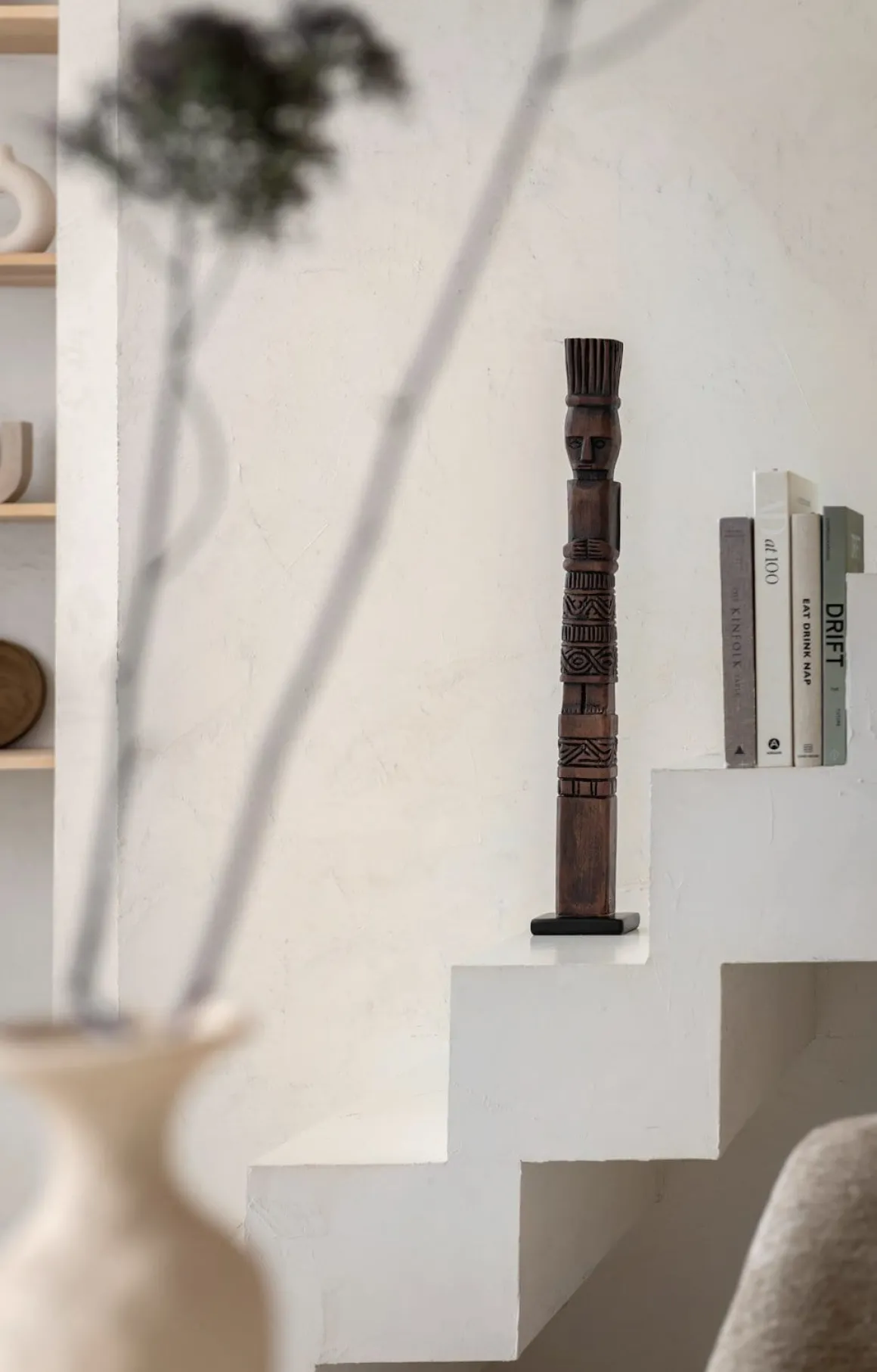 Dromen van verre oorden is altijd fijn toch? De beeldenserie MILAN van COCOmaison brengt je onmiddellijk in de sfeer van exotische plekken met witte stranden en zon in overvloed. Elk beeld is handgekerft uit lichte kunsthars en daardoor uniek. De beelden zijn donkerbruin en hebben een verweerde houtlook, waardoor je ze amper van originele houtsnijwerken kunt onderscheiden. Dit beeld is 62 cm groot, zijn ‘broertjes’ variëren in grootte van 68 tot 86 cm. Plaats er een of twee op een tafel of buffetkast en droom heerlijk verder tot je volgende vakantie!