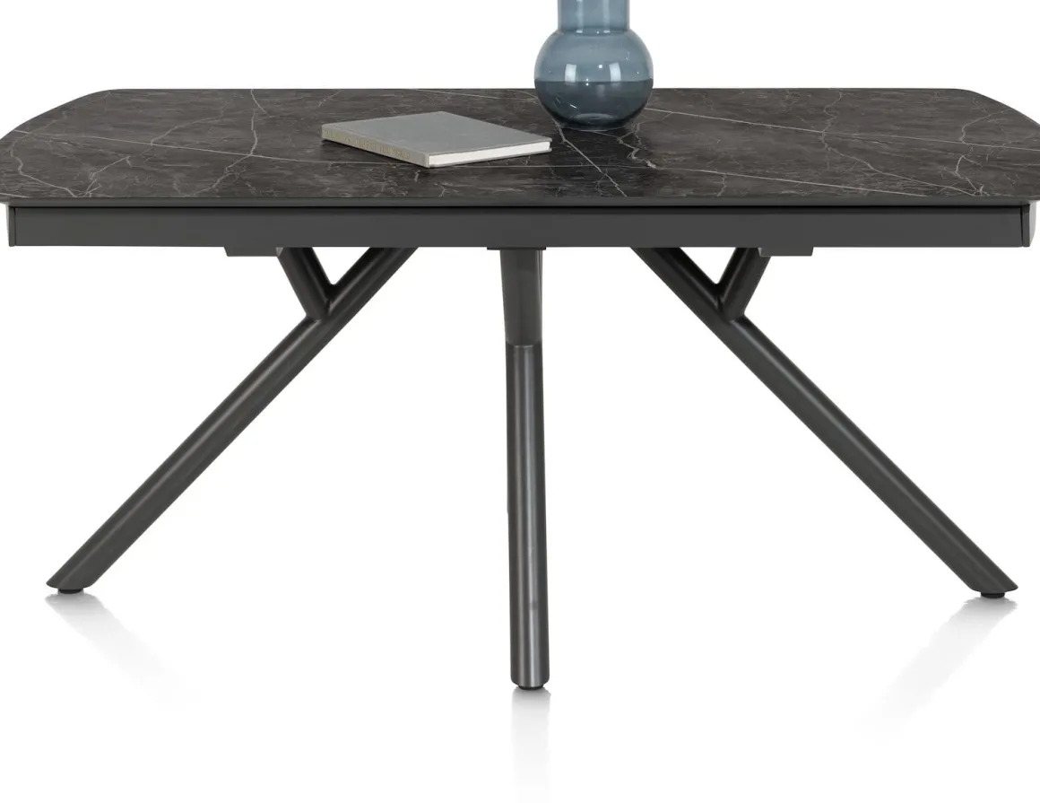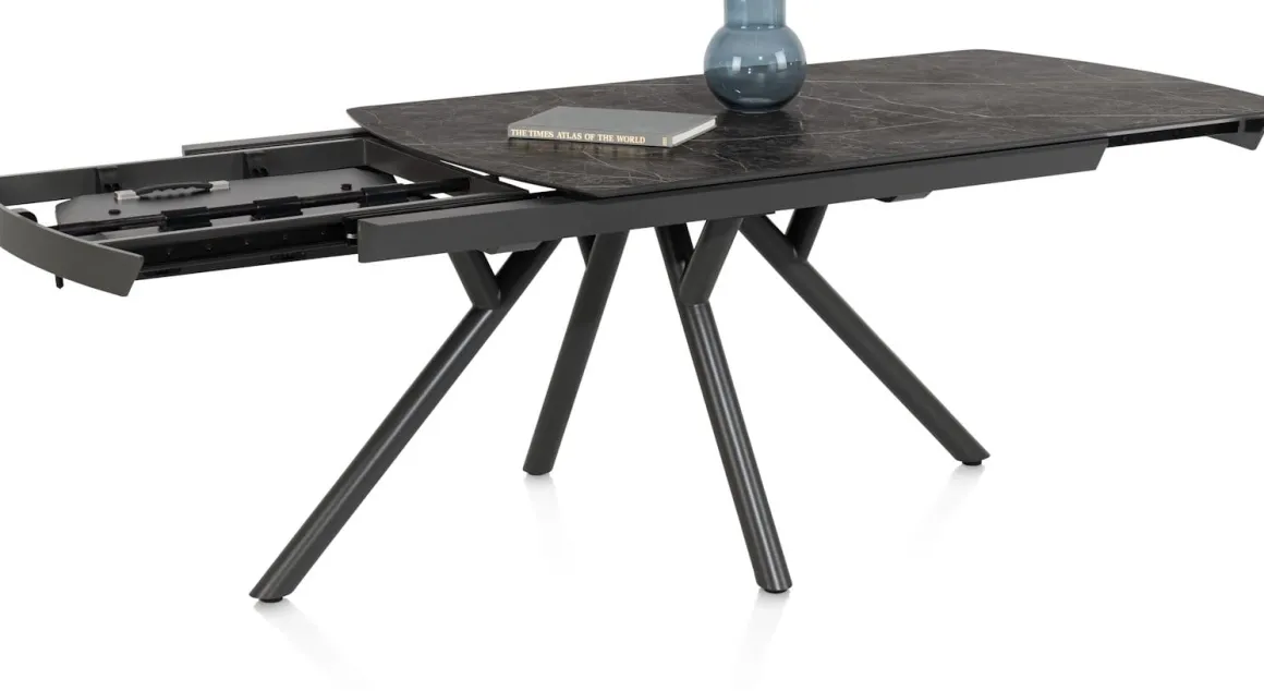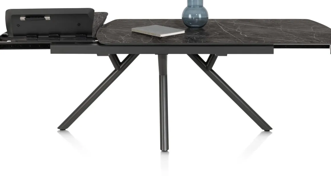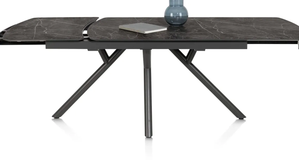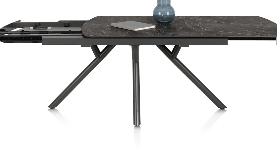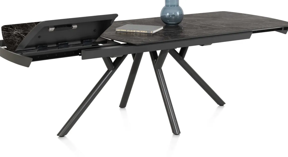 Wil jij altijd voorbereid zijn op onverwacht bezoek? Maak kennis met NOVELLO, een stijlvolle luxe uitschuiftafel van 200 x 100 cm die met 78 cm te verlengen is. NOVELLO is gemaakt van Primo Laminato (HPL) in de kleur onyx en heeft een prachtige marmerlook. Bij het uitschuiven van de tafel schuift het hele blad mee (zowel links als rechts) waardoor het moderne onderstel altijd centraal onder het tafelblad blijft staan. Het onderstel is vervaardigd van metaal in de kleur grafiet. Het blad van NOVELLO is ook verkrijgbaar in de kleur lichtgrijs en naar wens shop je het in eikenfineer voor een natuurlijk effect in je interieur.