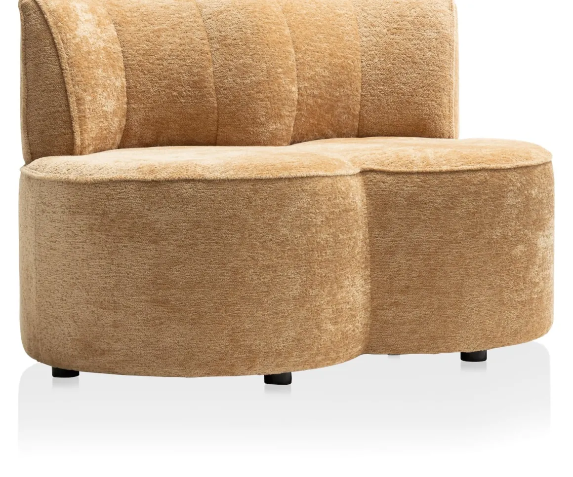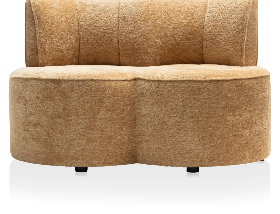 Dit bankje uit de Roan-serie van COCOmaison is met zijn bolle vorm een opvallende verschijning. In de serie zitten ook nog twee poefs en een fauteuil en alle elementen zijn door hun vorm perfect met elkaar te combineren. Ze zijn bekleed met een trendy stof en zijn verkrijgbaar in twee kleuren. Dit bankje is uitgevoerd in kleur oker en gemaakt van 30% metaal, 15% multiplex, 30% schuim en 25% stof. Goed om te weten: er worden twee sets poten meegeleverd, waardoor je de fauteuil op een standaard zithoogte kunt plaatsen, maar ook op een hoogte die geschikt is voor gebruik aan een eettafel. Het bankje is 120 cm breed, 71 cm diep en heeft inclusief rugleuning een hoogte van 74 cm.