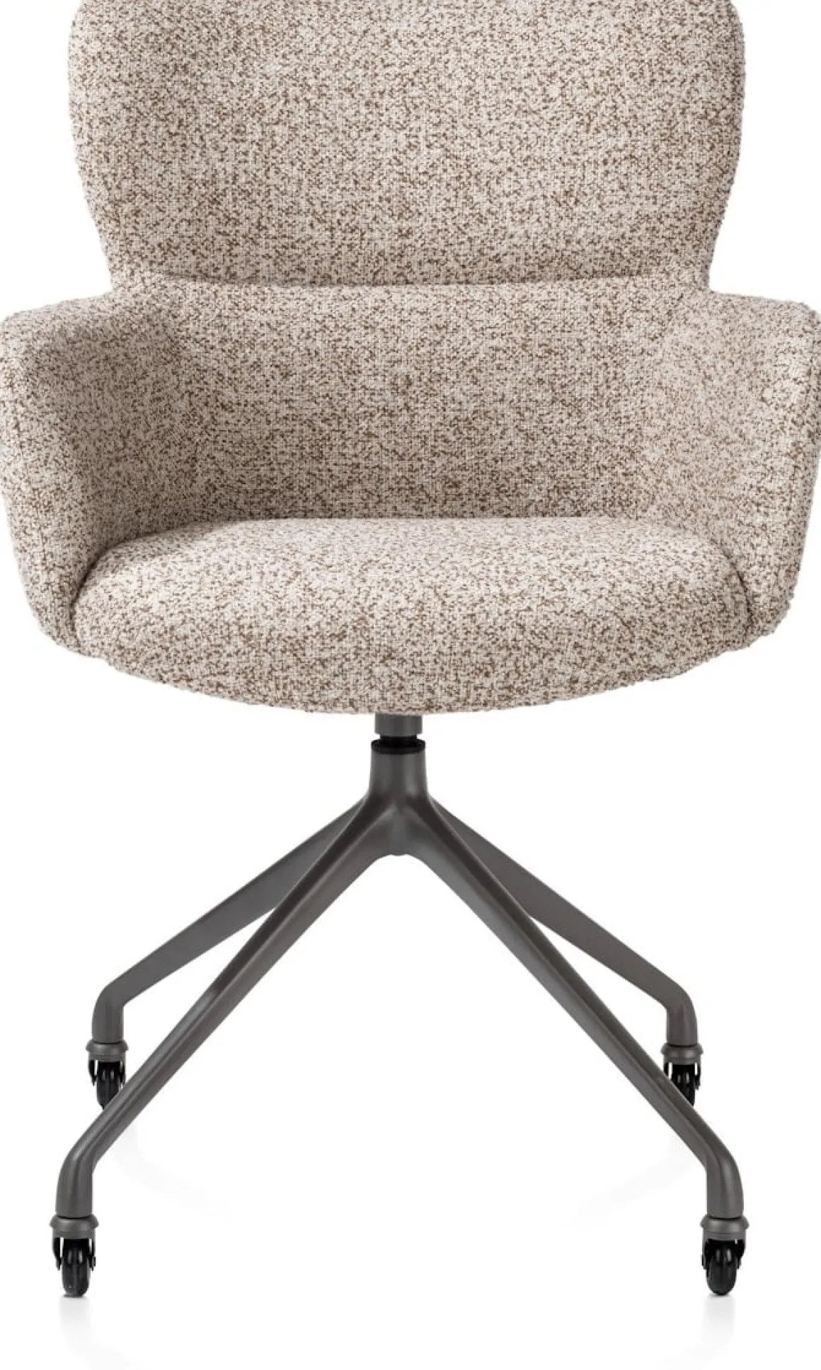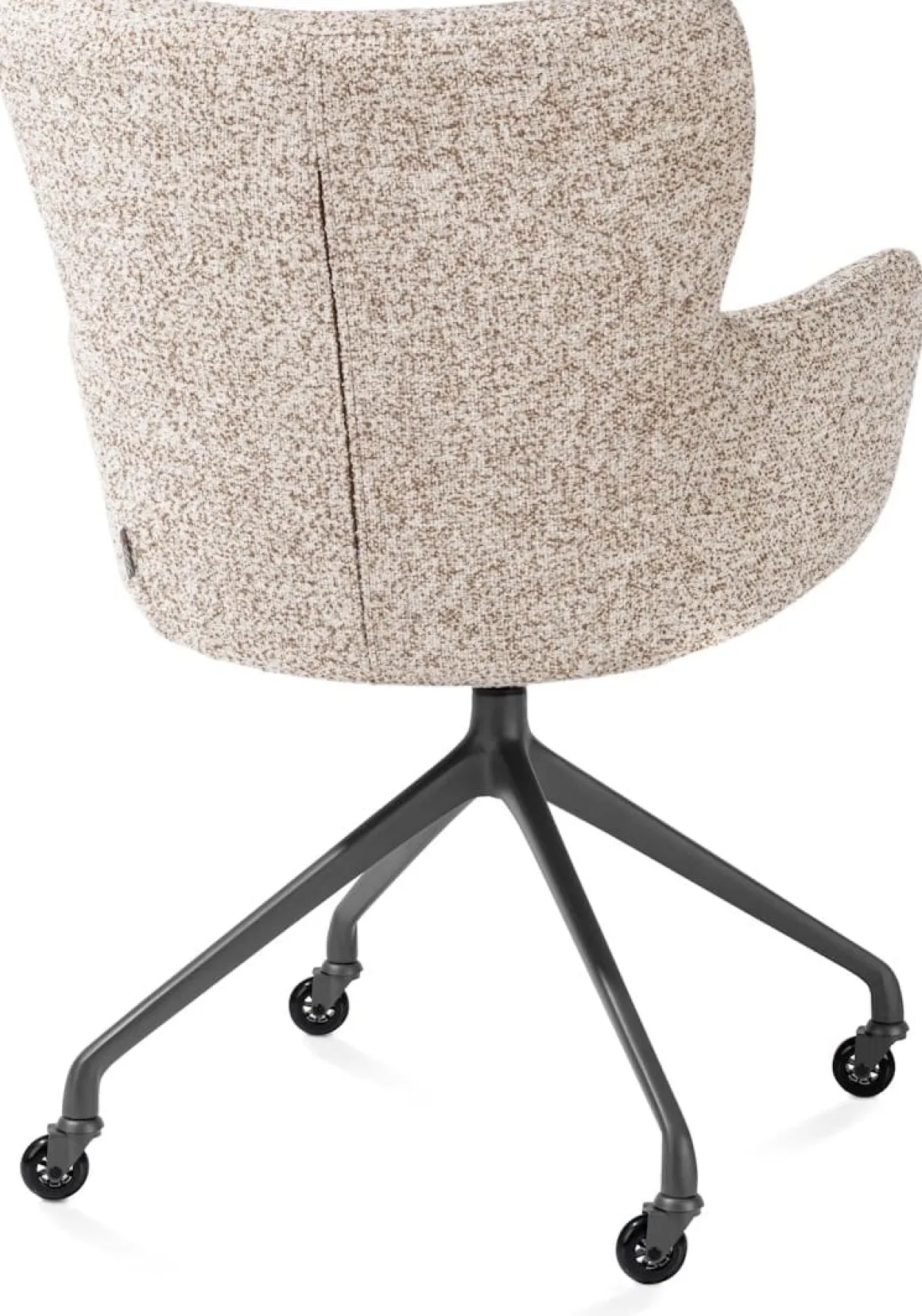 Met zijn warme koperkleur en praktische wielen is armstoel SAGE een stijlvolle én functionele keuze. De zitting is ruim en comfortabel, met licht gebogen lijnen die aansluiten bij het Scandinavisch geïnspireerde ontwerp. De stoel is bekleed met stof Luton: een zachte, bouclé-achtige stof met een rijke textuur die luxe én gezelligheid uitstraalt. Het aluminium frame in graphiet met geruisloze wieltjes maakt de stoel makkelijk verplaatsbaar; ideaal voor een dynamische eetkamer of thuiskantoor. Liever een andere kleur of afwerking? Bekijk de andere varianten van armstoel SAGE voor nog meer keus.