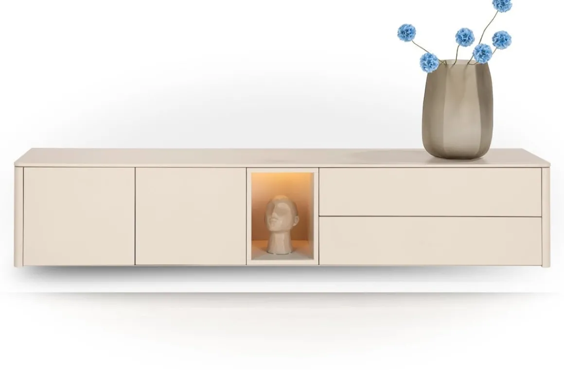 Trentino, Lowboard 210 cm. – 2-deuren + 2-laden + 1-niche – mdf gelakt – Creme