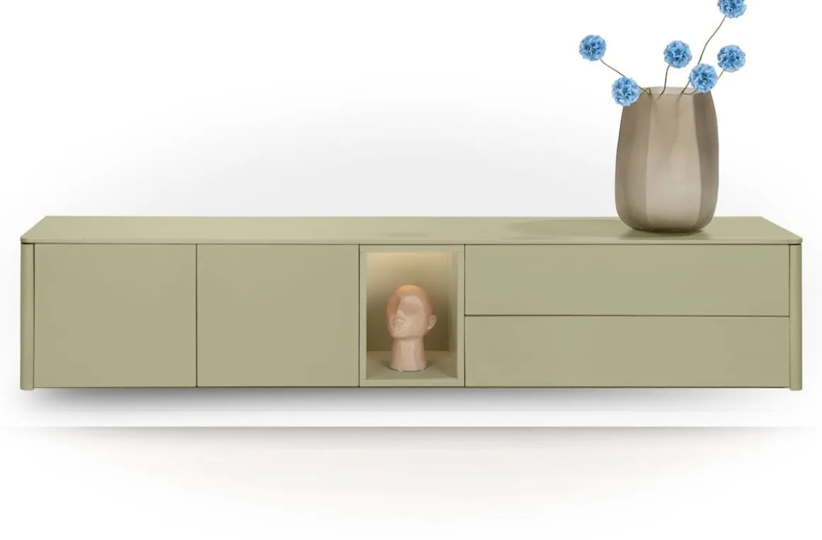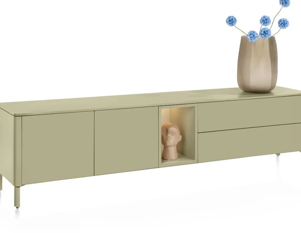 Trentino, Lowboard 210 cm. – 2-deuren + 2-laden + 1-niche – mdf gelakt – Olijf