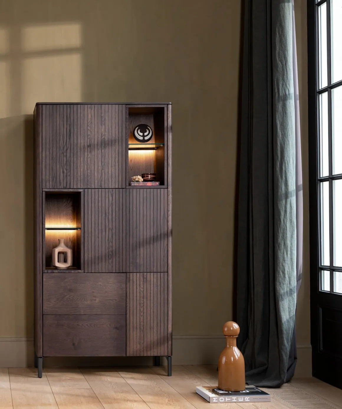 Will jij graag in stijl je spullen opbergen? Kijk dan eens naar deze bergkast uit de TRENTON serie van XOOON. De bergkast heeft een speels latjesmotief en is vervaardigd van eikenfineer in de kleur clay. TRENTON beschikt over 3-deuren + 2-laden + 4-niches en is voorzien van een praktisch push to open systeem. Dankzij de ledverlichting in de niches kun je je mooiste accessoires extra laten shinen. Het dressette staat op een grafietkleurig onderstel van metaal. Je shopt hem ook in de kleur naturel.