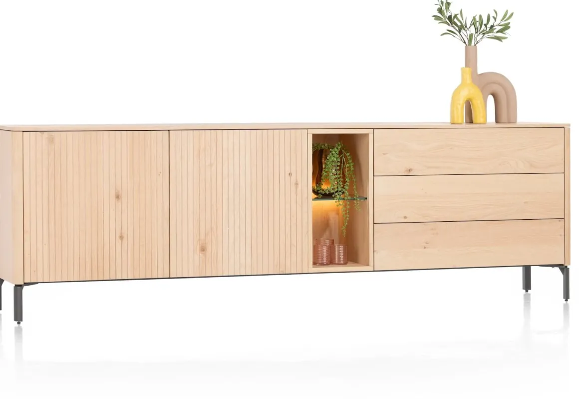 Met TRENTON haal je een eyecatcher van een dressoir in huis met lekker veel opbergruimte. TRENTON is gemaakt van naturelkleurig eikenfineer en staat op een onderstel van grafietkleurig metaal. De afgeronde hoeken geven zachtheid aan je interieur en het latjesmotief op de deuren zorgt voor een speels effect. Het dressoir heeft een afmeting van 240 cm en is voorzien van 2-deuren + 3-laden + 2-niches. TRENTON heeft een praktisch push to open systeem. Dankzij de ledverlichting in de niches zet je je mooiste items in de spotlight. Dit stijlvolle dressoir is ook verkrijgbaar in de kleur clay.