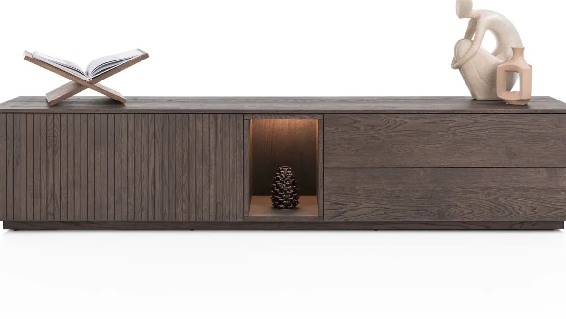 Aan opbergruimte geen gebrek met lowboard TRENTON dankzij 2-deuren + 2-laden + 1-niche. TRENTON is een prachtig eigentijds lowboard met vriendelijke, ronde vormen. Het is vervaardigd van eikenfineer in de kleur clay, wat zorgt voor net dat beetje pit in je interieur. Een gefreesd latjesmotief geeft TRENTON zijn unieke look. De deuren en laden zijn voorzien van een push to open systeem. Het lowboard rust op een stevig metalen onderstel in de kleur grafiet. Laat je verrassen door de andere uitvoeringen waarin TRENTON verkrijgbaar is.