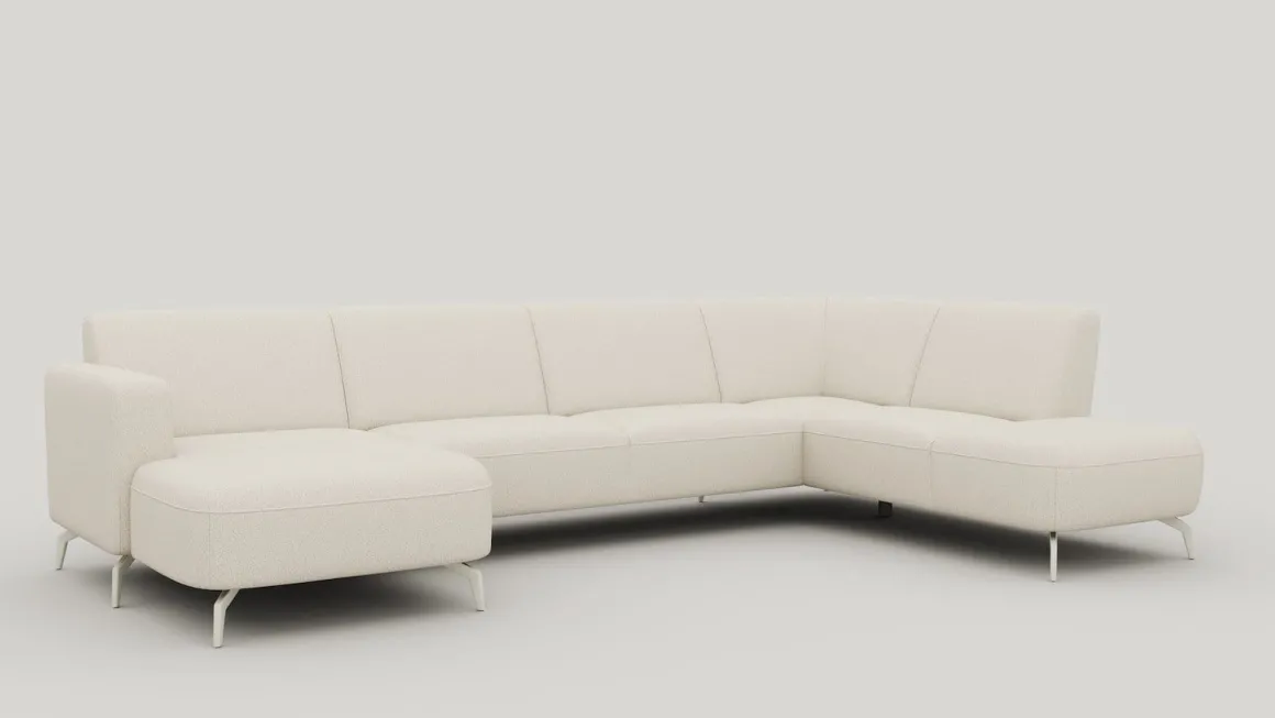 Houd je van rust en comfort in huis? Dan is deze TWIST-opstelling een perfecte keuze. De longchair (chaise longue) links, 2,5-zits zonder armen en ottomane (ligelement) rechts vormen samen een royale U-vormige bank met een zachte en luchtige uitstraling. De bank is bekleed met boucléstof Brioni in de kleur ivory en afgewerkt met een metalen poot in silk grey. Dankzij de pocketvering zit je extra comfortabel. Deze opstelling is verkrijgbaar in e kleur ivory, maar ook in crème, kiezel en lever.